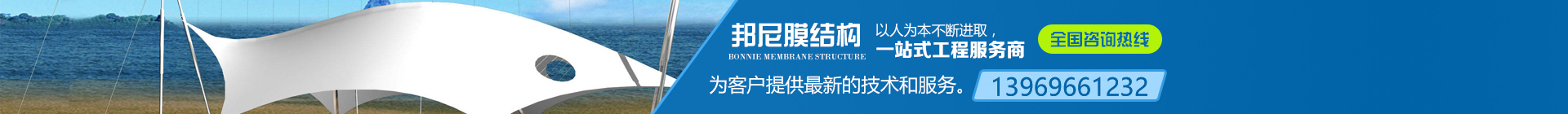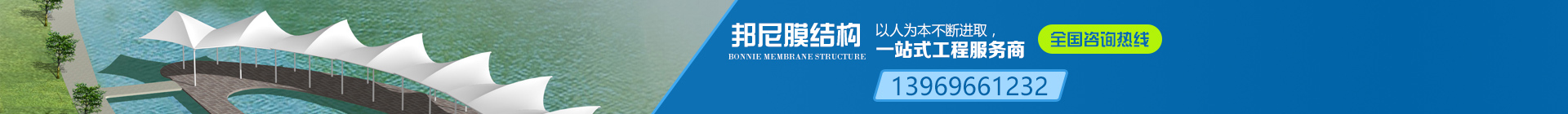 邦尼膜结构采用高强度柔性薄膜材料与支撑体系相结合形成具有一定刚度的稳定曲面,能承受一定外荷载的空间结构形式。其造型自由轻巧、阻燃、制作简易、安装快捷、节能、安全等优点,这种结构形式特别适用于大型体育场馆、入口廊道、小品、公众休闲娱乐广场、展览会场、购物中心等领域。
